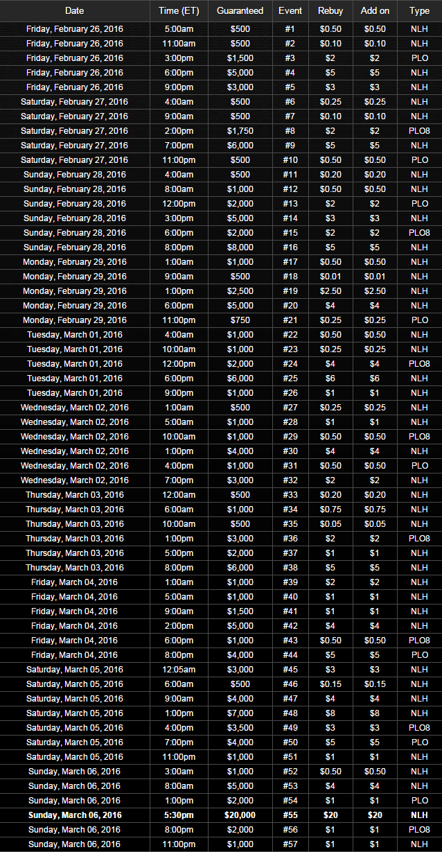 Serija turnirjev je odprta za vse BCP igralce, tudi če še niso opravili prvega depozita. Razpored: