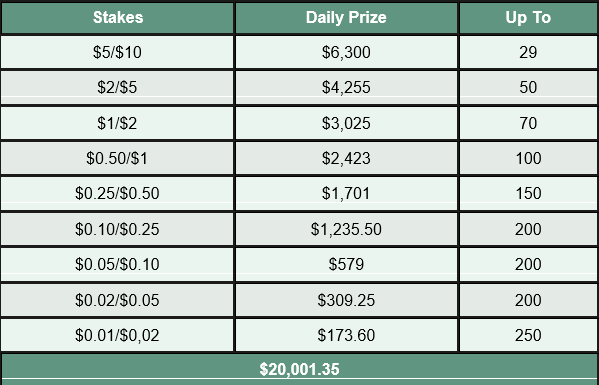 Ker gre za dnevne lestvice, to pomeni, da je skupni nagradni sklad neverjetnih $1.200.000. Vse kar morate storiti je, da igrate svoje najljubše Hold’em in Omaha Rush & Cash igre in osvojite denarne nagrade.