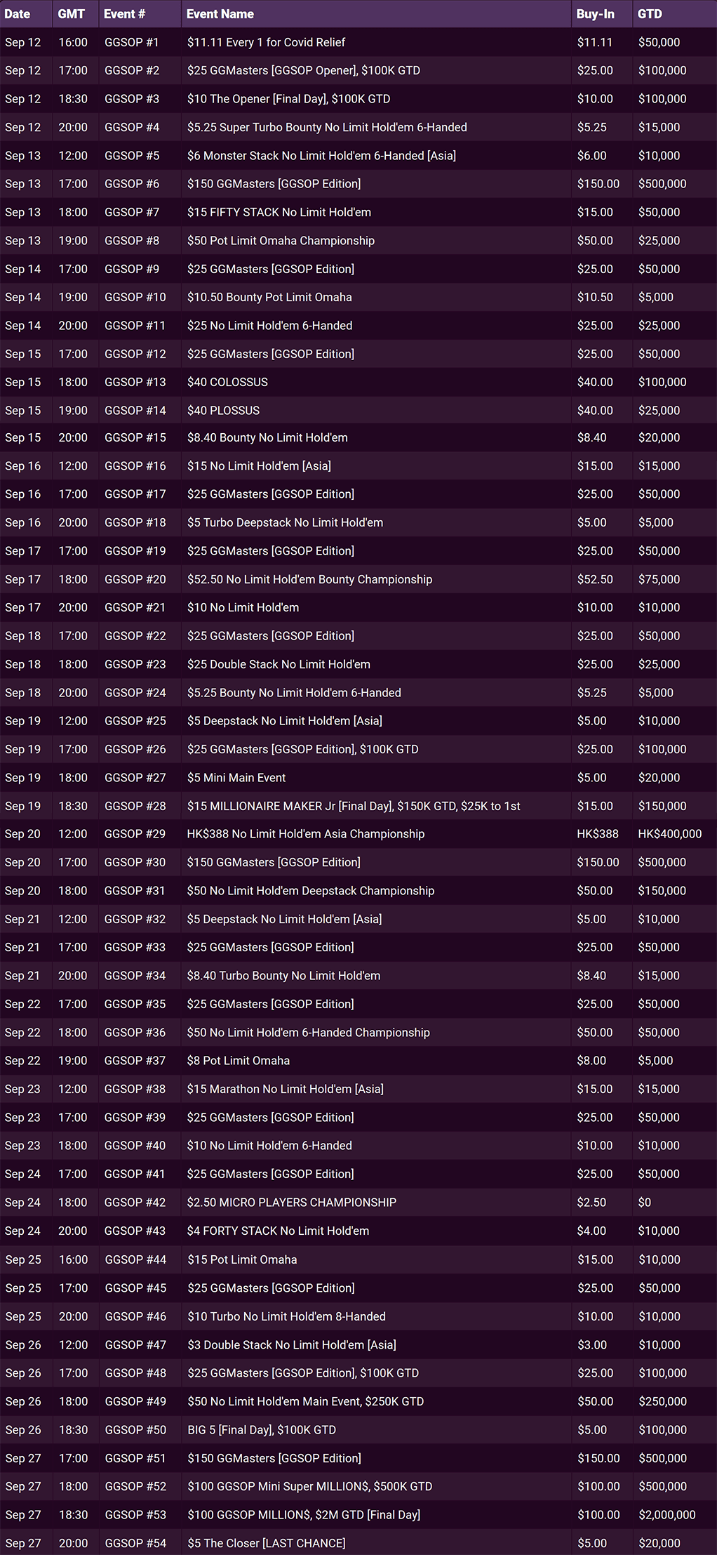 Na GG mreži (GGpoker, Natural8, 2bet4win) se 12. septembra začenja nova serija z naslovom GGSOP, ki se bo ponašala s skupnim garantiranim skladom 6…