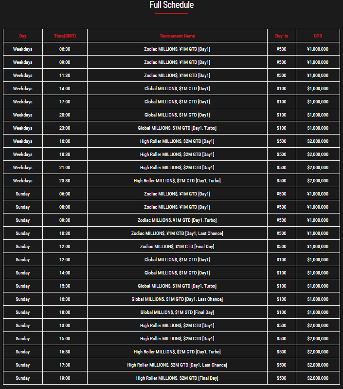 Prijavnina za Zodiac MILLION$ bo znašala 500¥, kar znaša okoli 70$. Turnir bo imel velik garantiran nagradni sklad 1.000.000¥ ali 140.305$. Vsak dan boste imeli tri možnosti da turnir pripeljete v Day2. Finalni dan bo potekal vsako nedeljo ob 14:00.