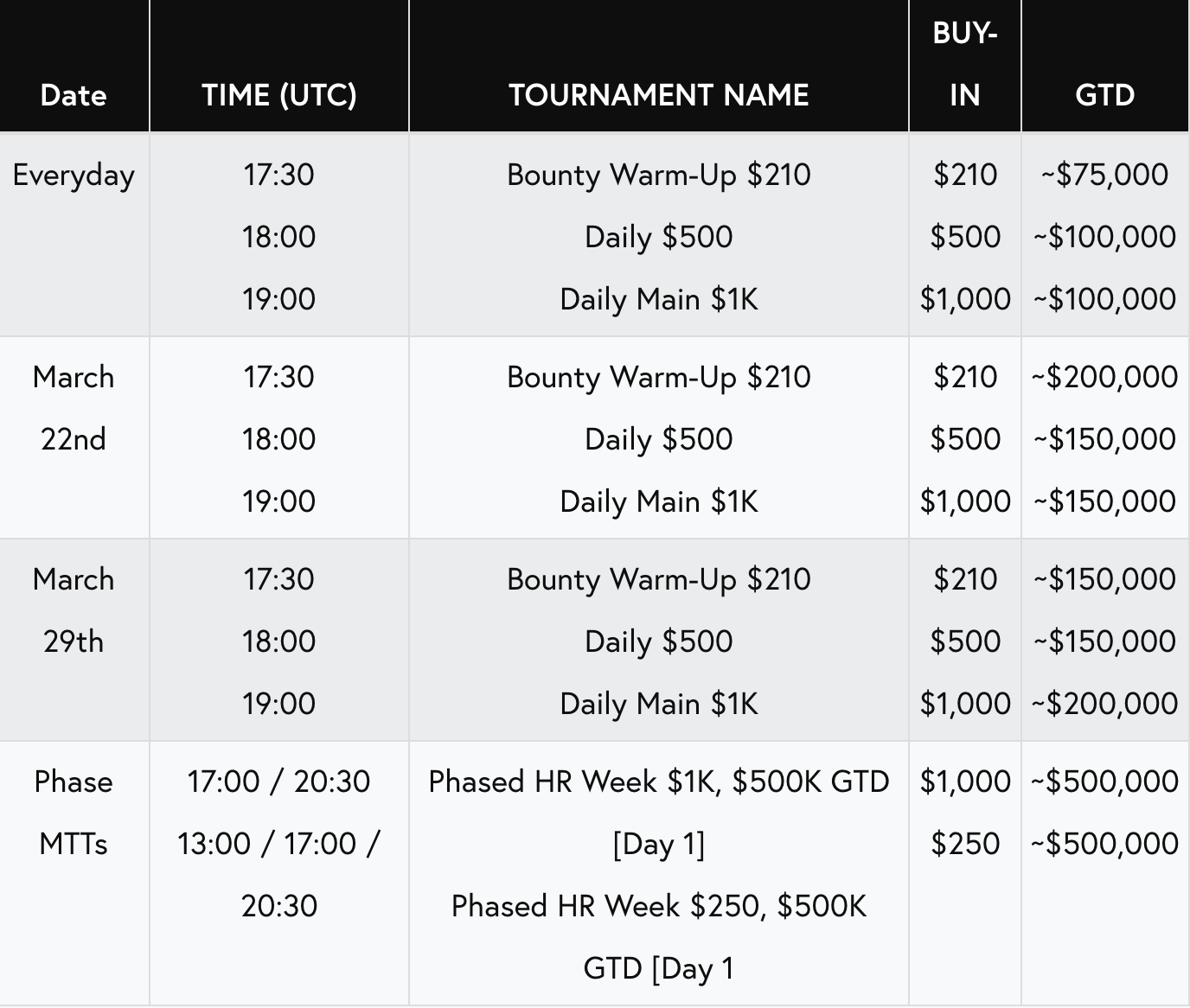 - Poudarek na $1K in $250 faznih HR turnirjih, ki bosta imela oba $500K nagradnega sklada! Fazni turnirji bodo imeli več prvih dni, z zaključkom v nedeljo, 29. marca