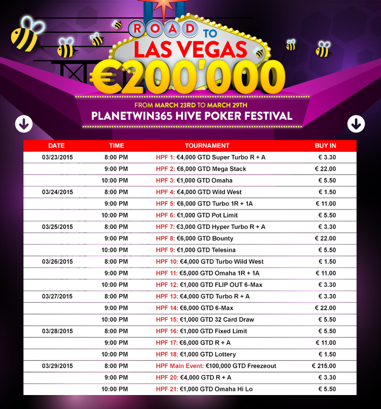 Najbolj zagrizene igralce bo Hive Poker Festival še dodatno nagradil. Podarjajo namreč 5 x €2,500 vredne počitnice v Vegasu. Pike bodo nagrajevali po spodnji formuli: