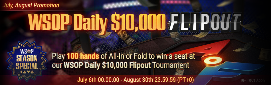 Vsak dan boste imeli priložnost osvojiti vstopnice za WSOP satelite tudi pri Flipout turnirju. Vse kar morate storiti je, da odigrate 100 handov All-in or Fold igre in prejeli boste vstopnico za dnevni WSOP $10.000 Flipout turnir. Turnir se bo odigral avtomatično, a bodo nagrade povsem naključne. Tako “zmagovalec” tega posebnega turnirja morda ne bo prejel najvišje nagrade.