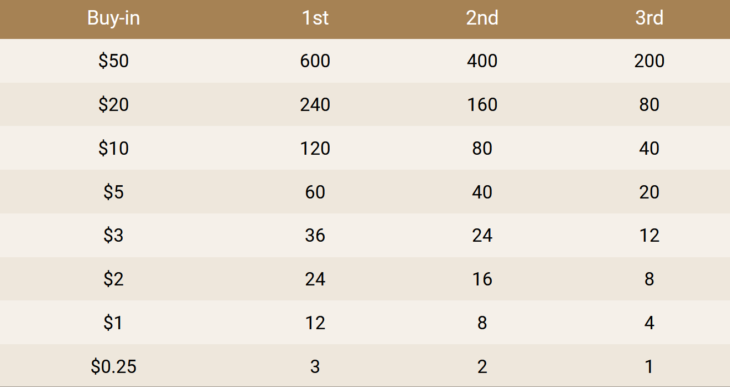 Izberite vaš željeni buy-in, igrajte turnirje in po vsakem končanem spinu dobite zlato. Koliko zlata dobite si lahko pogledate v naslednji sliki.