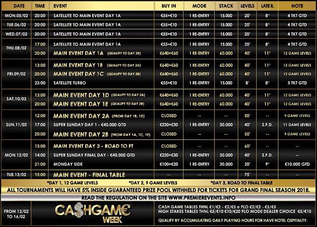 Prvi dnevi Main Eventa s 700 € prijavnine bodo potekali od četrtka 8. do sobote 10. februarja v petih delih od A do E. Preživeli bodo nato v nedeljo odigrali drugi dan 2A oz. 2B. V ponedeljek bomo dobili finaliste za finalno mizo, ki se bo odigrala v torek, ko se bo okronalo zmagovalca, ki bo bogatejši za vsaj 300 tisoč evrov.