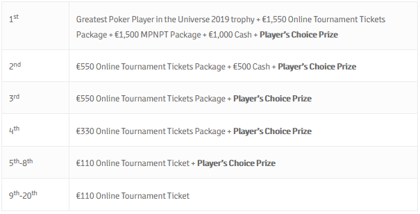Nagrajenih bo 20 igralcev, najboljših 8 pa bo lahko poleg drugih nagrad izbiral še med 1.550 € online vstopnicam, ali 1.500 € MPNPT paketom, ali 1.000 € v denarju.
