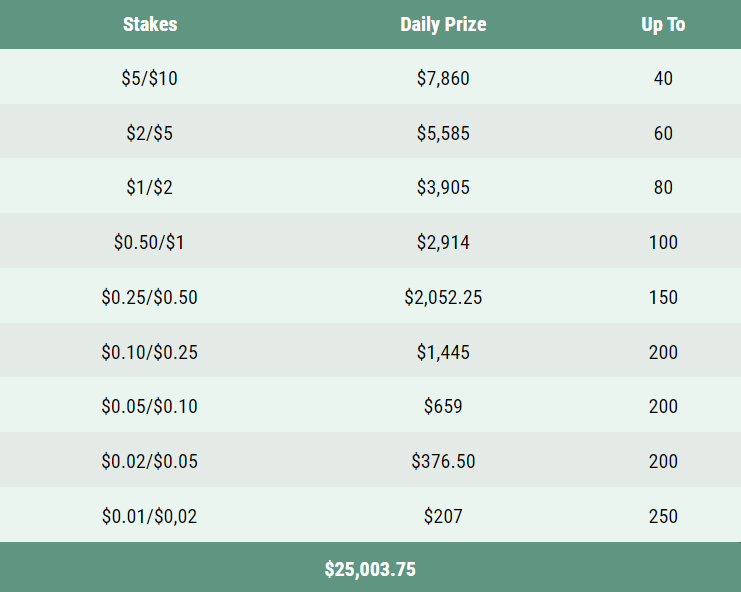 Ker gre za dnevne lestvice, to pomeni, da je skupni nagradni sklad neverjetnih $1.200.000. Vse kar morate storiti je, da igrate svoje najljubše Hold’em in Omaha Rush & Cash igre in osvojite denarne nagrade.