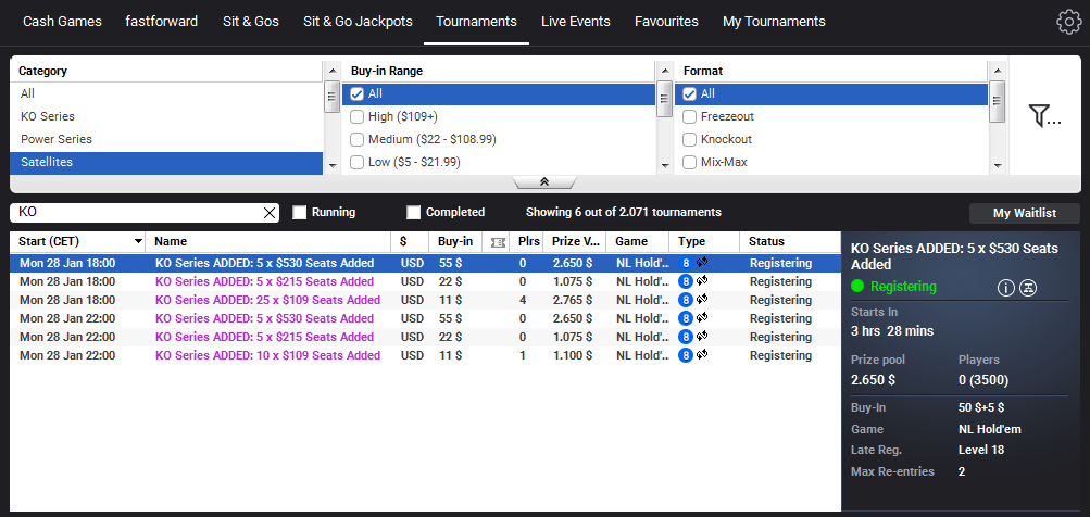 Poleg teg satelitov z dodanimi vstopnicami, bodo potekali tudi navadni, tako da imate res veliko priložnosti za udeležbo na enem izmed večjih turnirjev serije. V nedeljo pa ne spreglejte velikega satelita, kjer bo v nagradni sklad dodanih kar 50x$109 vstopnic!