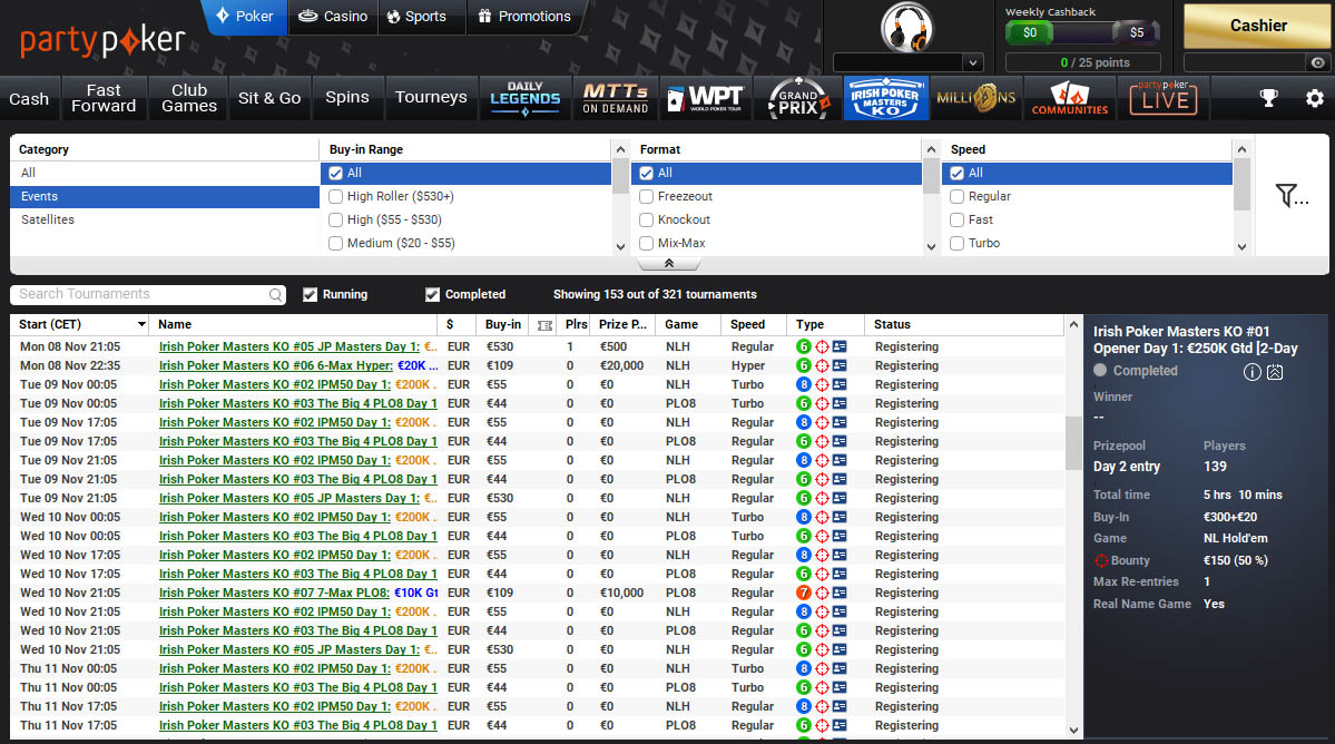 Na partypokru si želijo, da bi čim več igralcev uživalo v turnirjih Irish Poker Masters KO, še posebej na turnirjih z buyini, ki so običajno izven vašega dosega. Zato boste našli številne satelite po znižanih cenah, ki delujejo zdaj in ves čas festivala.