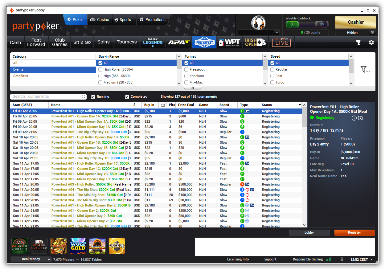 Oglejte si turnirje POWERFEST v lobbyju partypokra in našli boste The Big Fifty in The Big Fifty Knockout. Ta dva dogodka imata več prvih dni, pri čemer vsak vstop stane 55 $, ki se nato nadaljuje v Dan 2, kjer boste že v denarnih nagradah! V tradicionalnem Big Fifty je garantiranih 300.000 $, v PKO izdaji The Big Fifty Knockout pa 500.000 $!