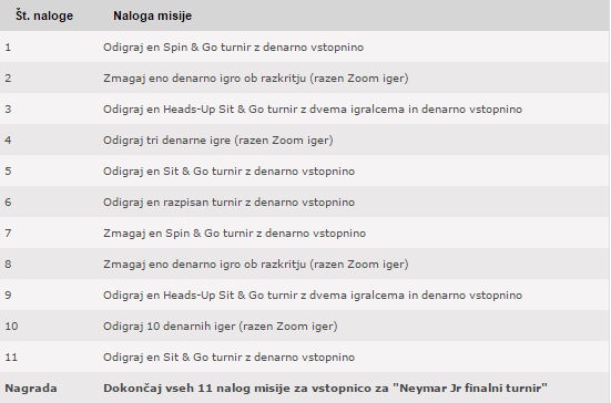 - 11 misij Neymarja Jr je mogoče dokončati le z igranjem denarnih iger. Preden začnejo igrati, morajo igralci klikniti “Začni” na prvi nalogi vsakega kvalifikacijskega obdobja misije, da bo njihov napredek merjen. Ko se bo začela prva naloga misije v kvalifikacijskem obdobju, bodo igralci samodejno prijavljeni za vse naslednje naloge v tistem obdobju misije. Ko dokončaš vseh 11 nalog v obdobju misije, boš prejel vstopnico za “Neymar Jr finalni turnir”. Vstopnico moraš uporabiti za ročno prijavo na enega od štirih finalnih turnirjev. Neuporabljene vstopnice bodo zapadle.