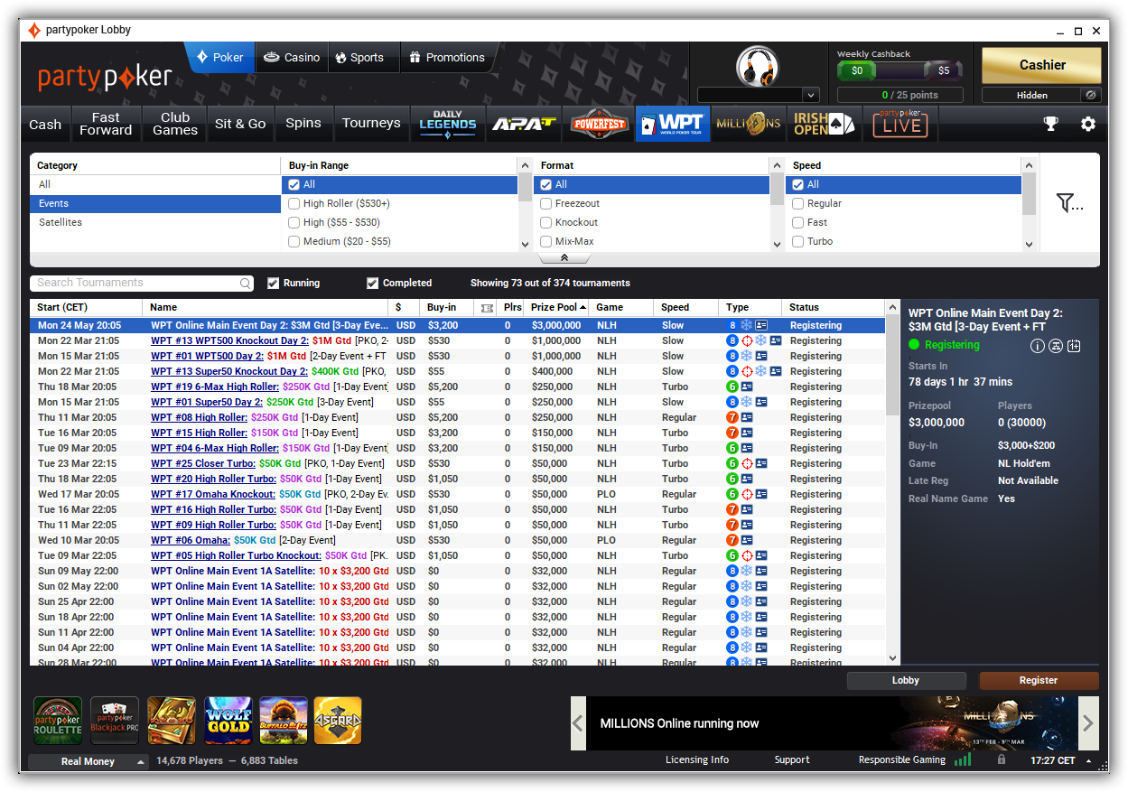 partypoker serija WPT500 že takoj na začetku skoči naravnost v glavni dogodek. Dan 1A $1M Gtd WPT500 serije se začne 7. marca z garantiranim nagradnim skladom v višini 1 milijon dolarjev.