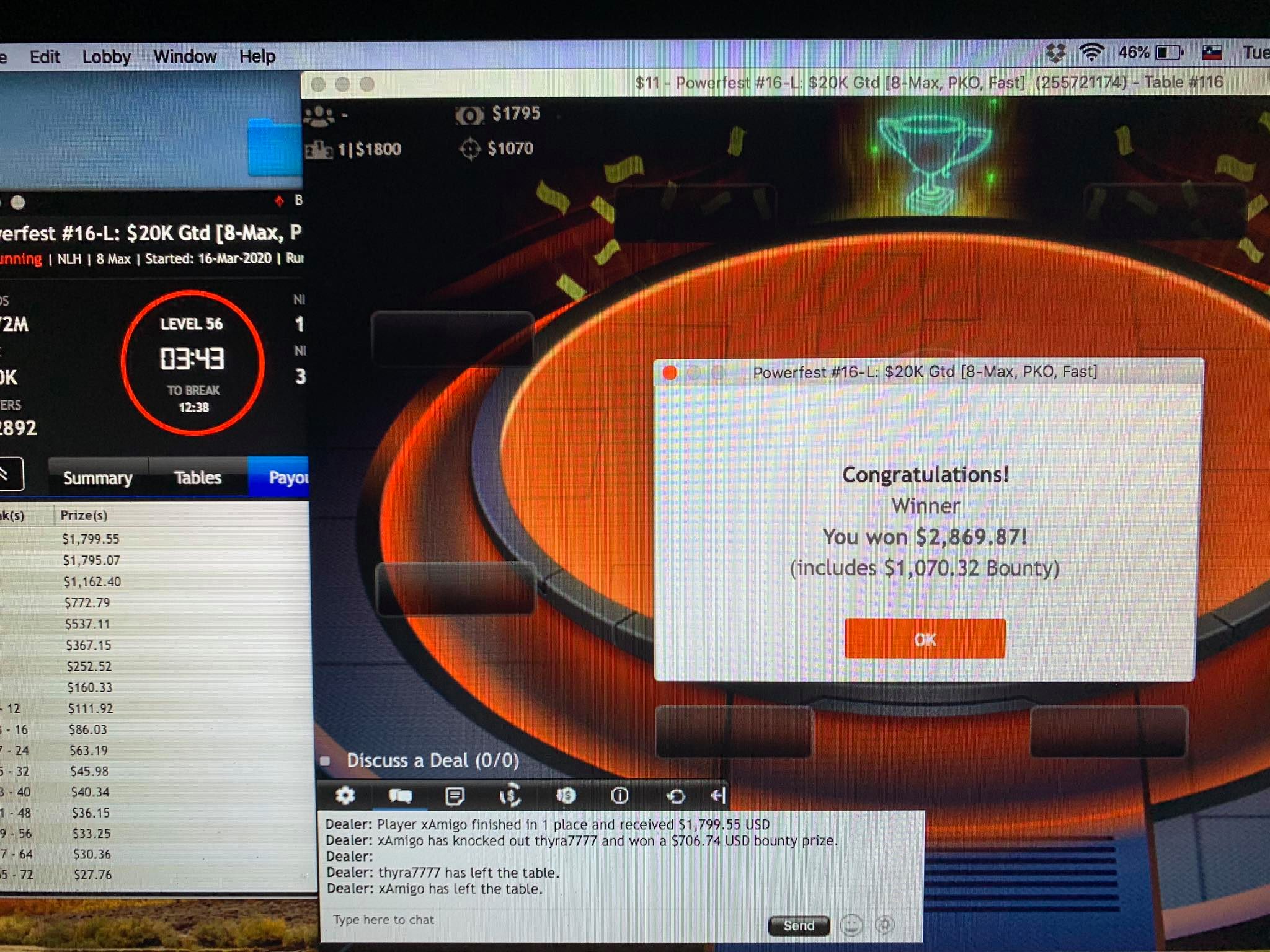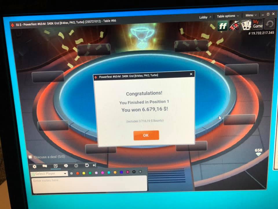 Na partypokru žal ne moremo več slediti rezultatom našim junakom, vseeno pa sta se javila dva naša uporabnika: xAmigo je osvojil $11 Powerfest #16-L za $2.869,87, soldzerGTO pa z zmago na $55 Powerfest #65-M: $40k GTD turnirju, ki mu je navrgla kar $6.679,16 denarne nagrade.