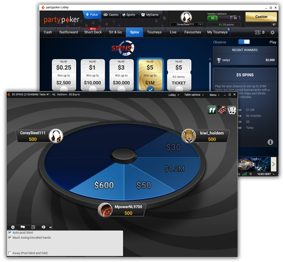 SPINS so PartyPokrovi Sit&Go turnirji s tremi igralci v katerih se pred začetkom izžreba naključno velikost nagradnega sklada z multiplikatorjem od 2 do 240.000. To dejansko pomeni, da lahko s $5 buy-inom osvojite velikansko glavno nagrado v višini $1.000.000!
