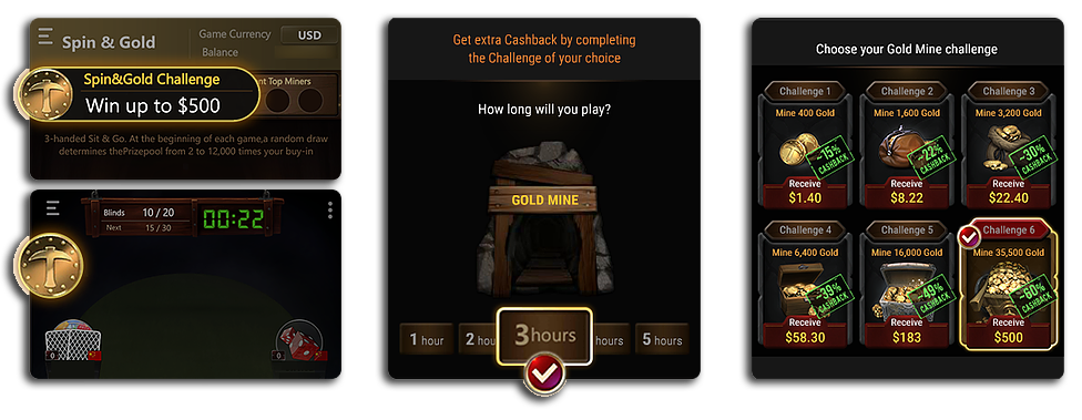 Spin&Gold so Jackpot SNG-ji, ki se odigrajo med tremi igralci. Ob registraciji pa se zavrti posebno kolo, ki izbere za kakšen nagradni sklad se bodo igralci spopadli. Poleg tega lahko v času promocije v posebnem izzivu vsakih 8 ur zaslužite dodatnih $500 nagrad!