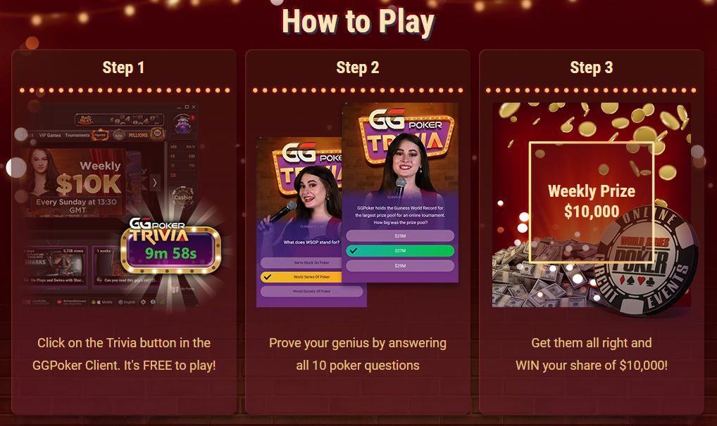 Vsako nedeljo ob 15:00 GG mreža (GGPoker, Natural8, 2bet4win) organizira kviz, posvečen različnim temam pokra, vključno z zgodovino WSOP in svet…