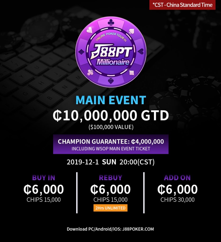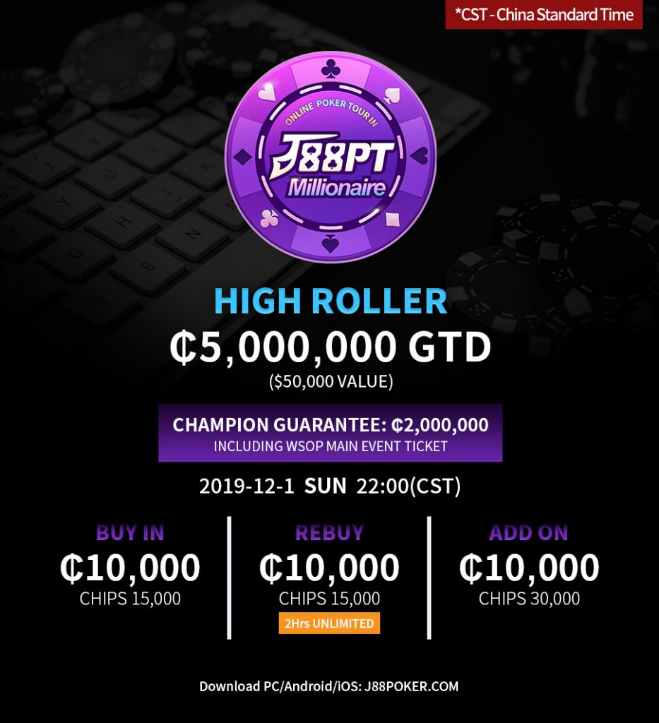 Prvi J88PT Millionaire se bo odvil 1. decembra in na sporedu bosta dva turnirja z visokim nagradnim skladom. Main Event s prijavnino $60 (₵6000) bo imel $100.000 nagradnega sklada, High Roller z buyinom $100 (₵10.000) pa $50.000 nagradnega sklada.