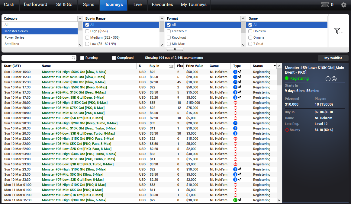 Ponovno je tukaj Monster turnirska serija, ki bo postregla s kar 2,5 milijona dolarjev nagradnega sklada, prijavnine pa se začnejo že od $2,20 naprej. Od 10. do 17. marca se bo zvrstilo kar 194 turnirjev.