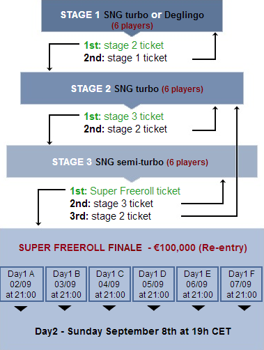 Vsak torek, do 27. avgusta bodo organizirani freeroll turnirji, kjer se boste borili za karto za drugi in tretji nivo.