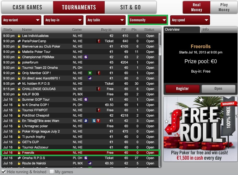 Turnirje najdete v Winamax lobbyju – ‘Tournaments’ – ‘Community’.