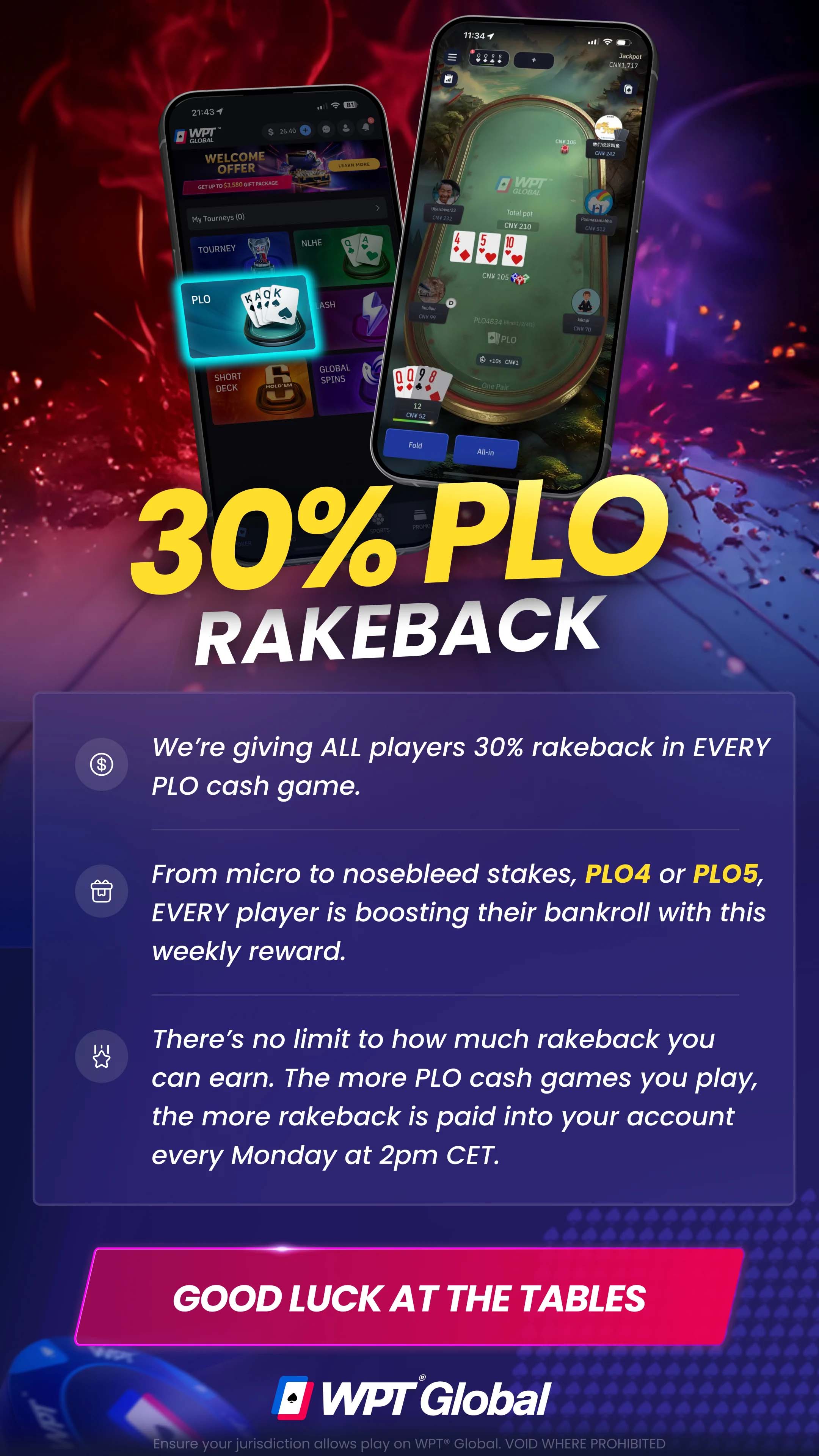 Do nadaljnjega WPT Global ponuja 30-odstotni rakeback vsem igralcem, ki sedejo za denarne PLO mize. Ne glede na to, ali igrate PLO s štirimi kartami (PLO4) ali s petimi kartami (PLO5), boste dobili nazaj 30 % vplačanega rakea. Vključitev v program je samodejna in brez drobnega tiska. Preprosto igrajte – ne glede na limite – in prejmite plačilo vsak ponedeljek ob 14-ih.