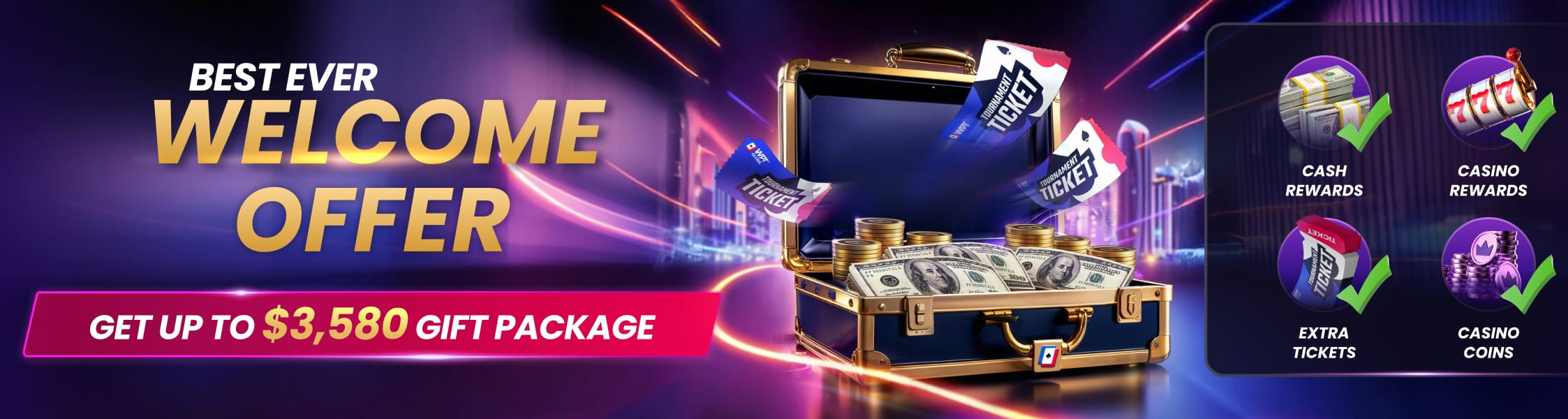 Če na WPT Global igrate prvič, vas čaka najboljša ponudba dobrodošlice do sedaj. Paket vključuje 100-odstotno vračilo prvega pologa do 3.000 $, poleg tega pa še brezplačne turnirske vstopnice in igralniške kovance. Skupna vrednost teh nagrad lahko doseže do 3.580 $!