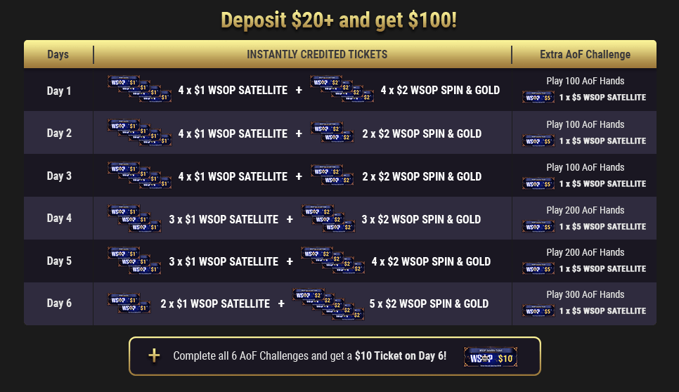 V vsakemu od šestih dni odigrajte zahtevano število handov v AoF igri in prejeli boste 5 $ WSOP ticket. Če izpolnite vseh šest izzivov, na koncu prejmete še dodaten 10 $ vreden ticket.