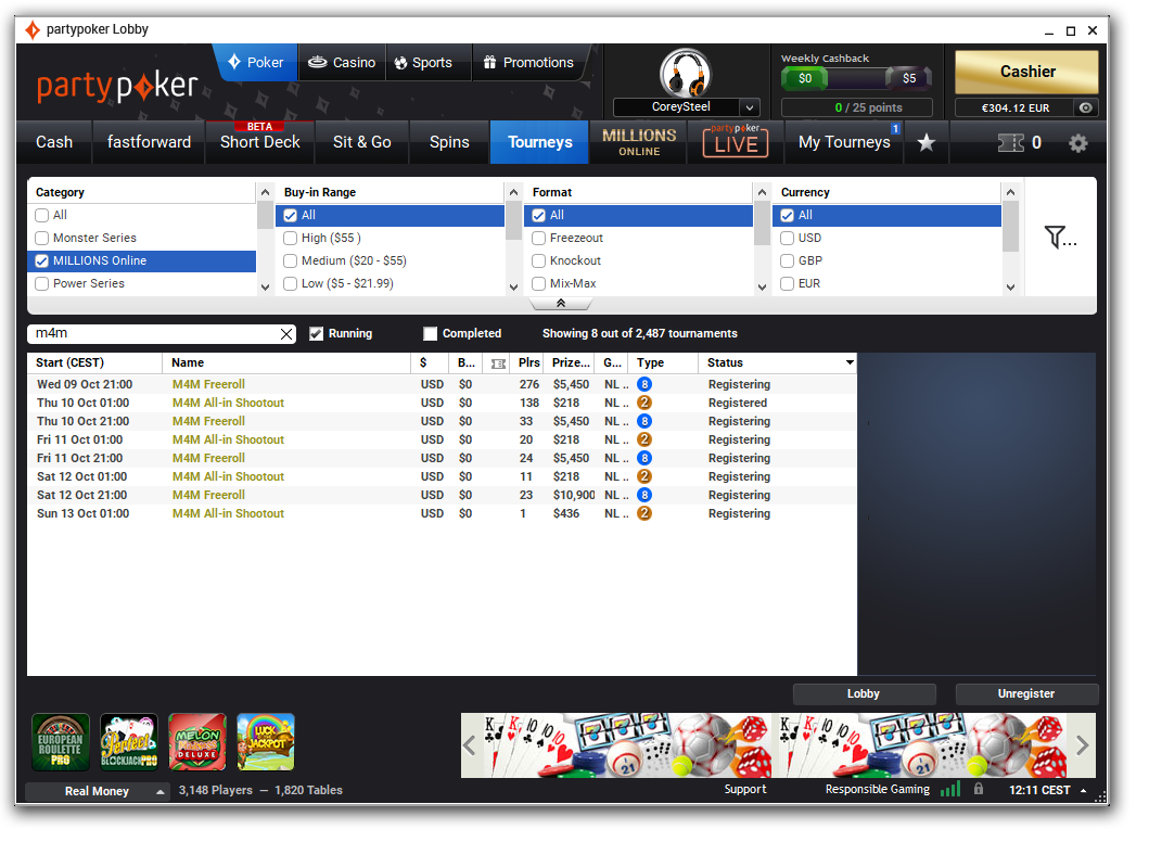 - M4M Freeroll – Običajen turnir, kjer lahko pokažete svoje znanje, podeljenih pa bo tudi precej več $109 vstopnic.
