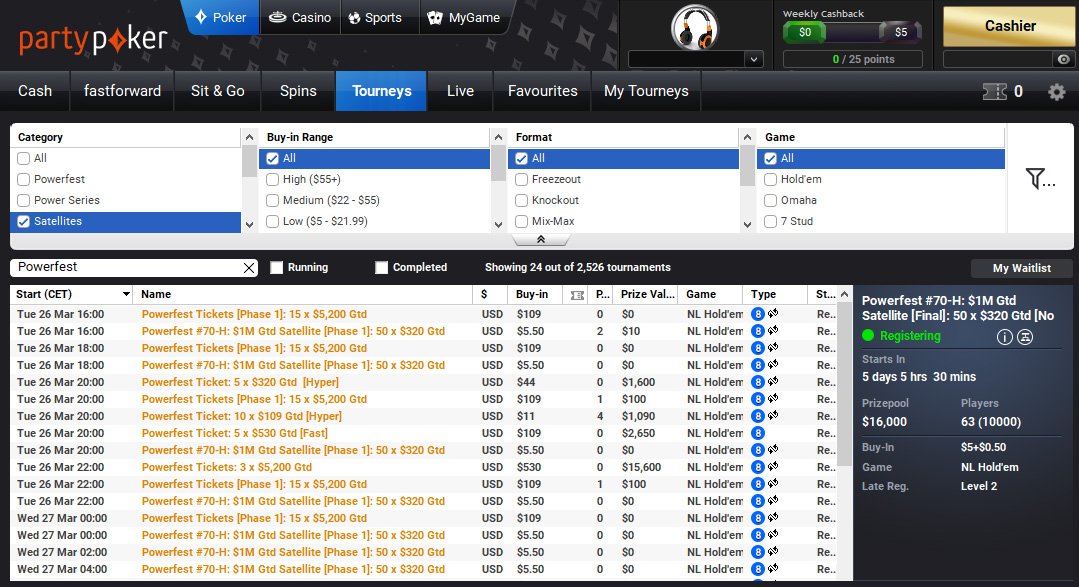 Na PartyPokru Ĺľe potekajo sateliti za POWERFEST turnirje. Tako imate tudi vi priloĹľnost, da z majhnim vloĹľkom igrate turnirje te seruhe in se potegujete za bogate denarne nagrade. Satelite Ĺľe najdete v PartyPoker lobiju, vstopnine se gibljejo od $5,50 naprej!