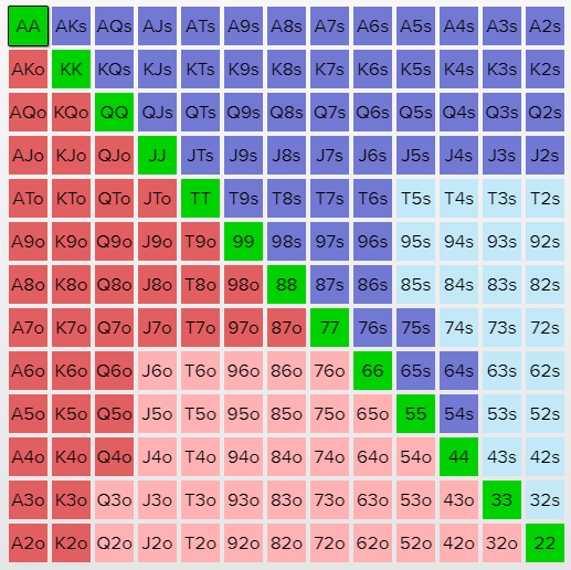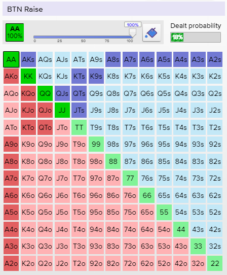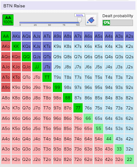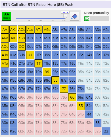Najprej si bomo ogledali, kakšni so rangi, če se zoperstavimo proti igralcu z optimalno igro. Spodaj lahko vidimo BTN opening range, naš reshoving range in nato še BTN calling range.