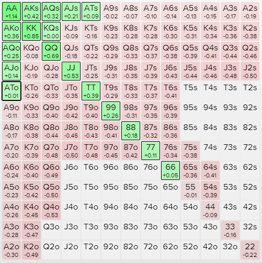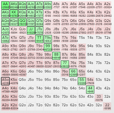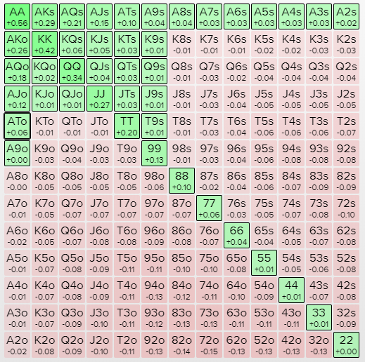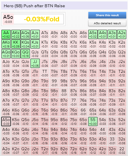 BTN-ju smo dodali samo 55, A9s, KQs v njegov calling range in profitabilni handi, s katerimi gremo lahko all-in, so padli iz 19% na samo 11%, zato morate biti pozorni na nasprotnike in kakšne tendence imajo.