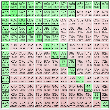 Če primerjamo te range v situaciji, ko ne igra ICM, vidimo, da igramo lahko precej širše. Naš 3-bet range skoči iz 19% na 31%, kljub temu da nas kliče z večimi handi.