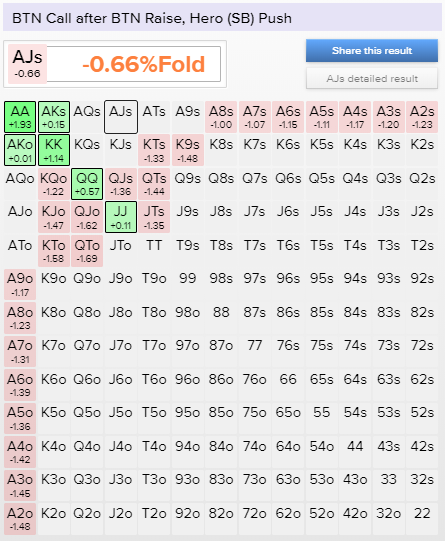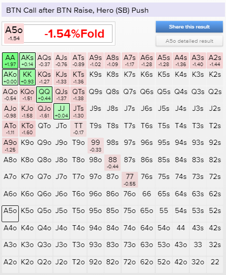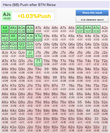 Sprememba je očitna. Ker BTN sedaj lahko pričakuje, da se mu bo BB večkrat zoperstavil z agresijo, mora zategniti svoj opening range – na le 17%. To spremeni tudi naš odgovor, saj lahko sedaj porinemo le 8,6% handov.