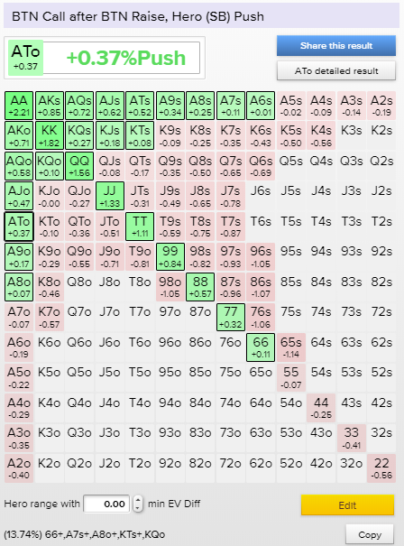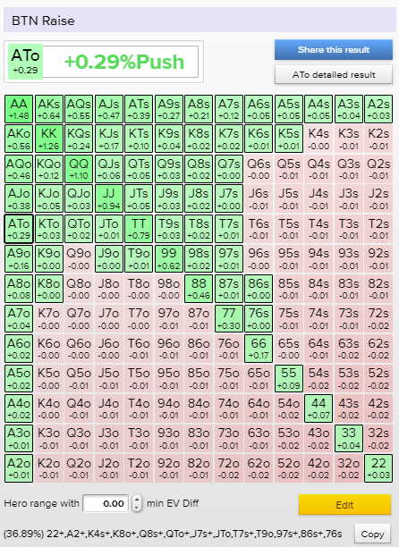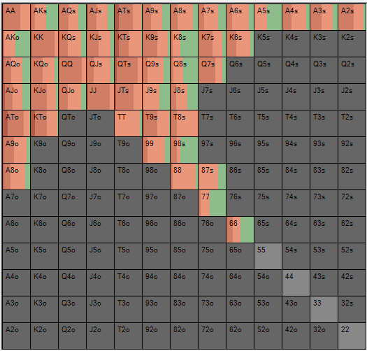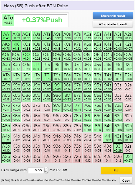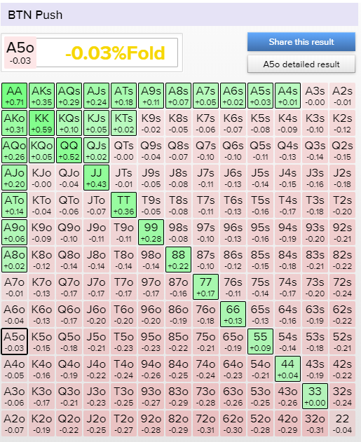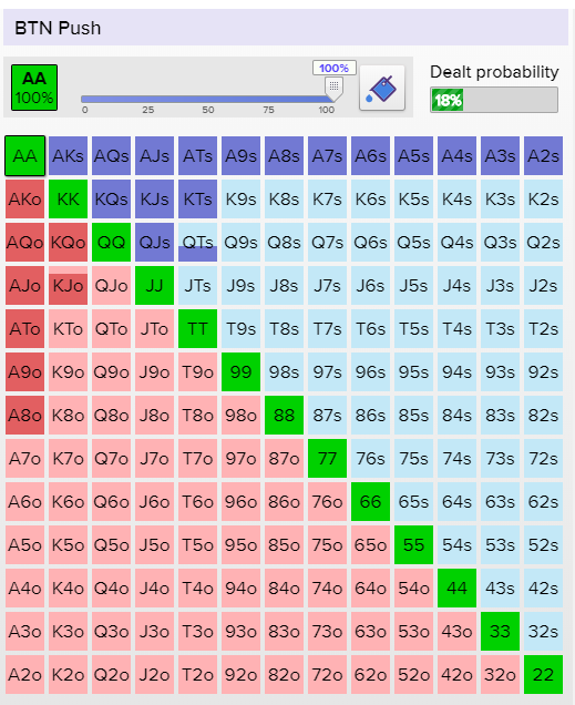 Tudi tokrat si pogledamo nasprotnikov shoving range, da vidimo, če lahko napravimo kakšne spremembe. Gotovo lahko trdino, da bi igralec porinil tudi 22 z BTN s 15bb in enako velja za pobarvane ase, zato dodamo A3s in A2s.