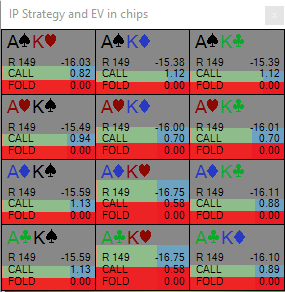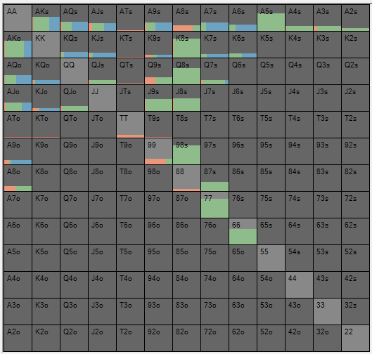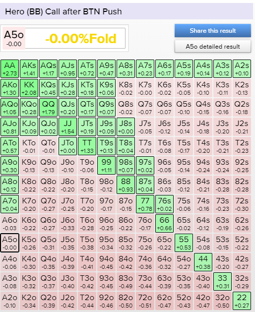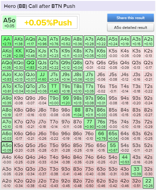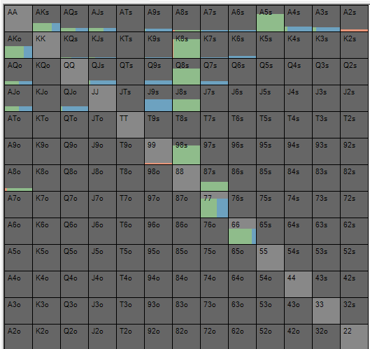 Hkrati pa je zanimivo videti, s katerimi handi vseeno lahko kličemo, to so 97s, 76s, Q9s itd., ki so enostavno boljši kot A5o v tej situaciji glede na nasprotnikov range.