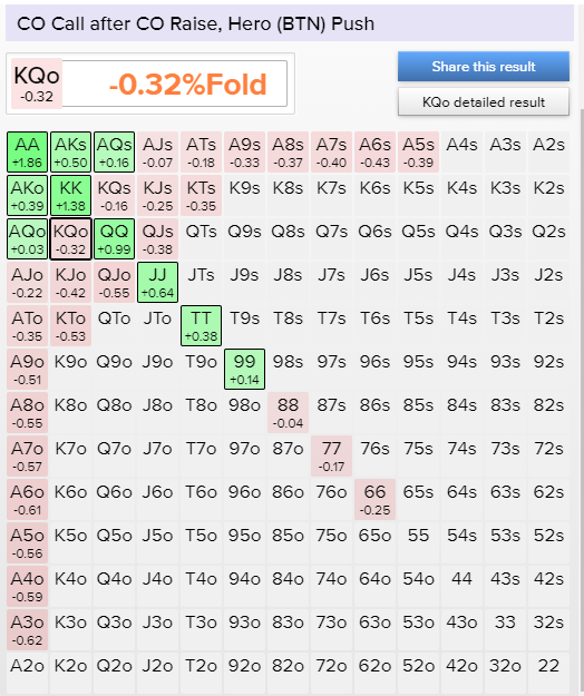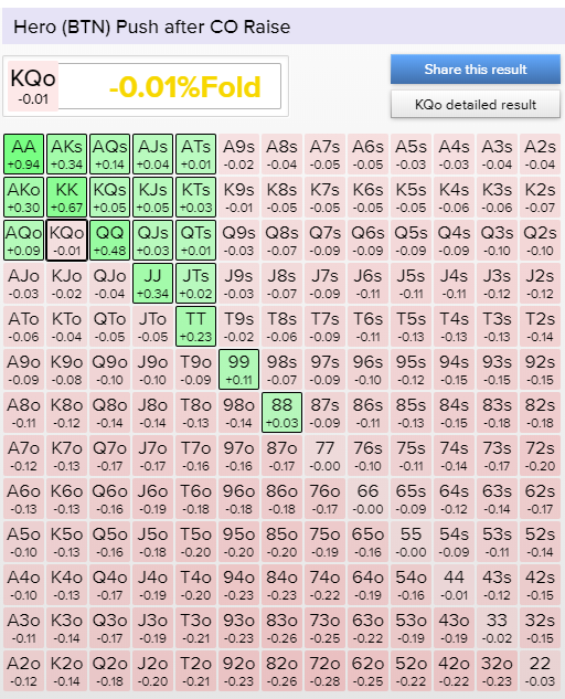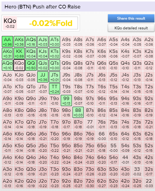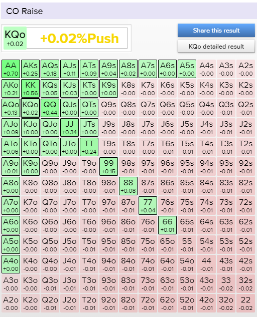 Vseeno pa je vedno treba iti skozi vse range in si ogledati, kako bi se hand odvil, če igralci ne bi igrali po Nashu. V tem primeru ni igralo vloge, četudi smo povečali range open raisea, ampak smo na drugi strani tudi predpostavili, da bi igralca na SB in BB klicala širše, zato KQo vseeno dela izgubo.