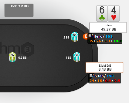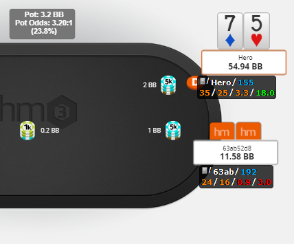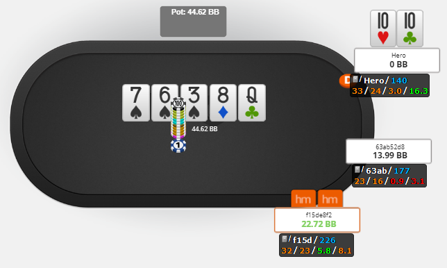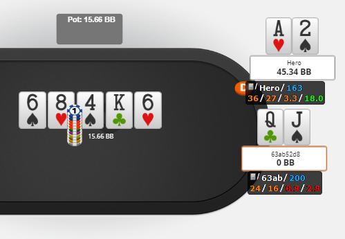 Igralec je ostal zelo aktiven, čeprav se je njegova dinamika spremenila, odkar je bil nazadnje vodilni po žetonih. Naš učenec je torej predvidevam, da bo vseeno igral široko, zato se je odločil za rejam.