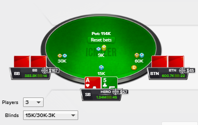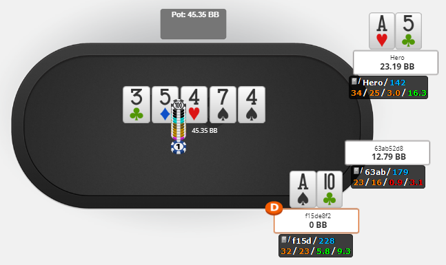 Naslednja zanimiva situacija se je zgodila, ko so bili v igri še trije. Nabrali smo nekaj žetonov, sedimo na BB s 40bb in A5o in si delimo vodstvo s SB. Igralec na BTN je short s 15bb in zeli velikim 22-kratnim začetnim bountyem.