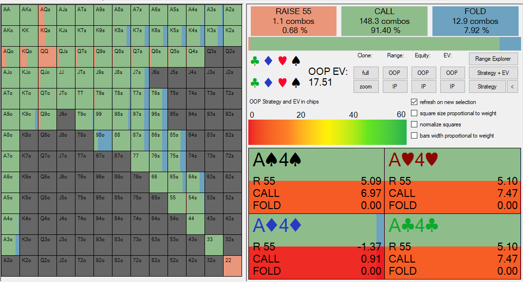 Kličemo 93% handov in foldamo le 7%, oziroma 2,2% našega prvotnega rangea.