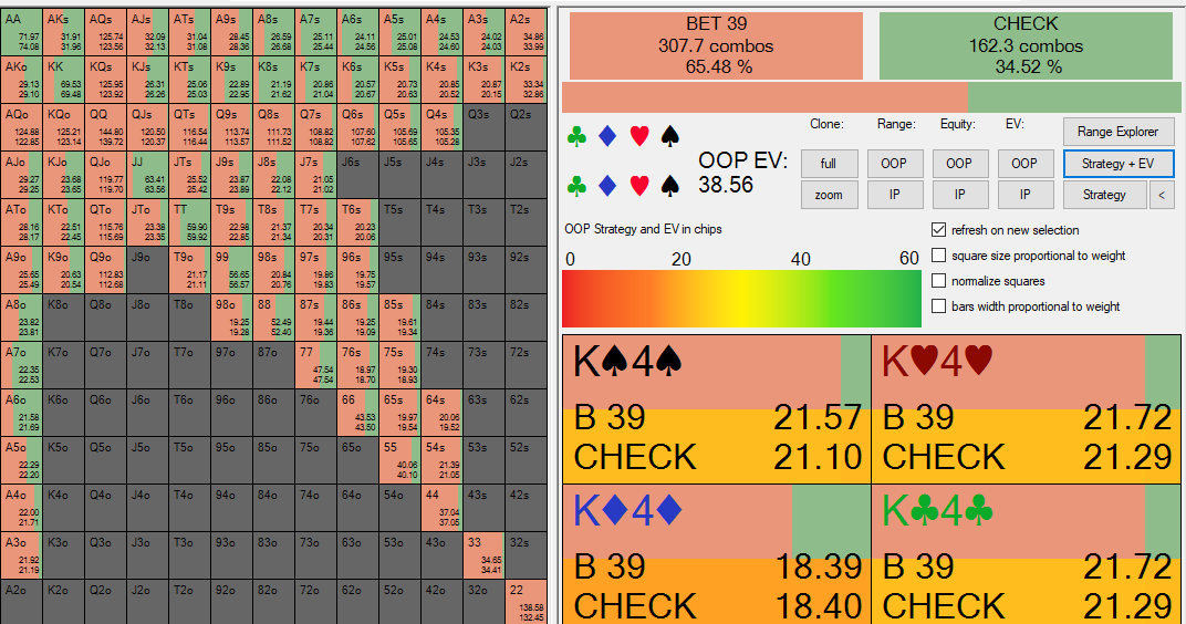Checking range z namenom pustimo nekoliko močnejšega in se pripravimo na to, da bo igralec na BB pogosto stavil, kar tudi vidimo v praksi. Big blind naj bi stavil le 32% svojega defending rangea, vse ostalo pa bi moral narediti checkback. A v praksi je drugače, saj vidimo precej več stav proti zgrešenim cbetom, vendar upravičeno, saj le malokdo c/c z večino svojih handov, ki jih niso stavili.