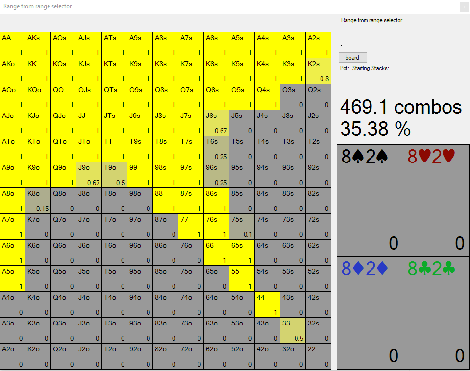 Recimo, da odpremo CO in nas nasprotnik pokliče na BTN. Naš range je videti enak kot v prvem primeru, vendar pa sedaj igramo izven pozicije, zato moramo, kot že omenjeno, nadaljevati previdneje, saj naša prednost rangea na tem boardu ni dovolj velika, da bi nadomestila informacijsko pomanjkljivost, s katero smo soočeni.