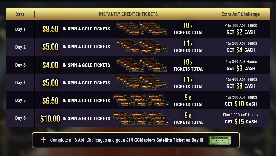 Dodatnih 60 $ pa lahko prejmete, če enostavno odigrate dovolj All-in or Folde iger v teh šestih dneh. Odigrajte dovolj handov, kot je razvidno na tabeli zgoraj in prejeli boste 45 $ direktno na vaš poker račun. Če opravite vseh šest izzivov, pa prejmete še 15 $ vredno GGMasters satelitsko vstopnico.