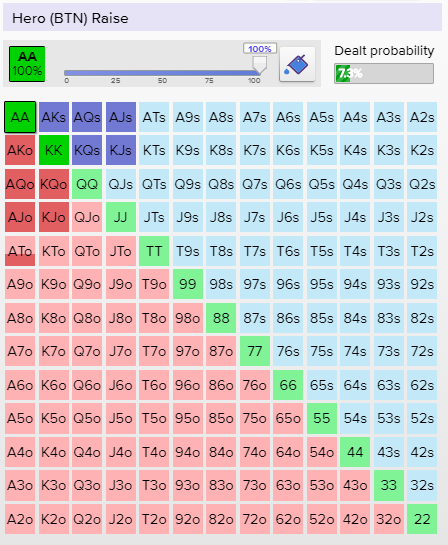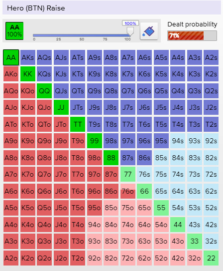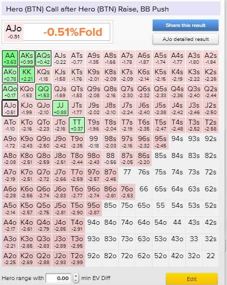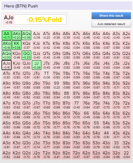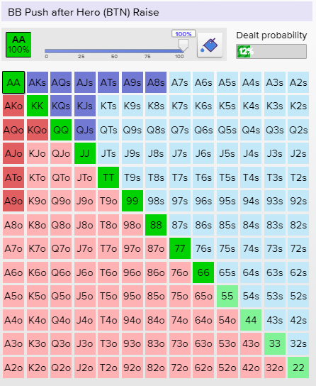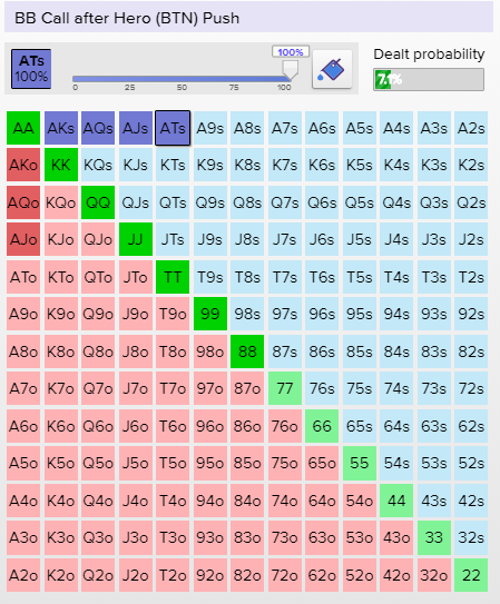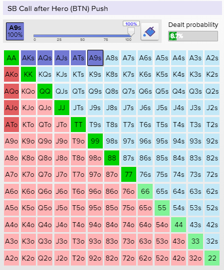 Tukaj lahko vidimo, da če povečamo calling range na nekaj bolj realnega – small blind iz 3,3% na 8,7% in big blind iz 4,3% na 7,1%, se naš range, ko porinemo vse žetone v sredino, zelo spremeni.
