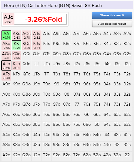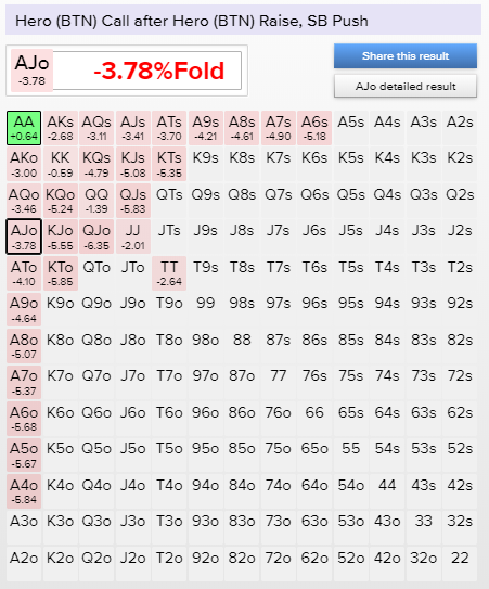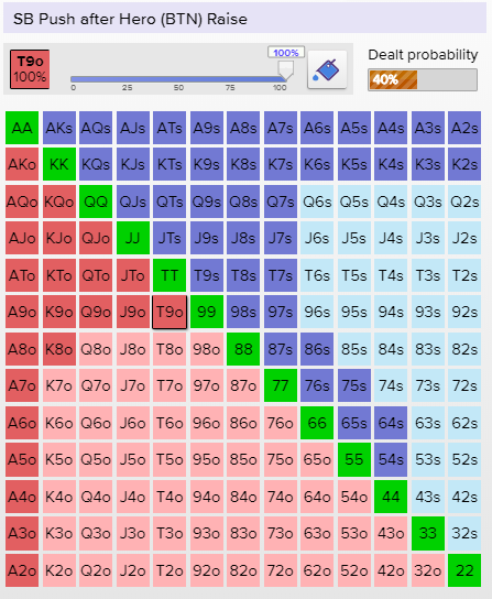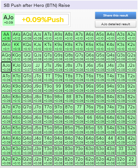 Če igralec na small blindu porine 40% svojih handov, ko min-raiseamo, lahko odpremo 18% naših handov. Vendar ker je njegov shoving range toliko manjši, lahko v tem primeru profitabilno kličemo le z AA.