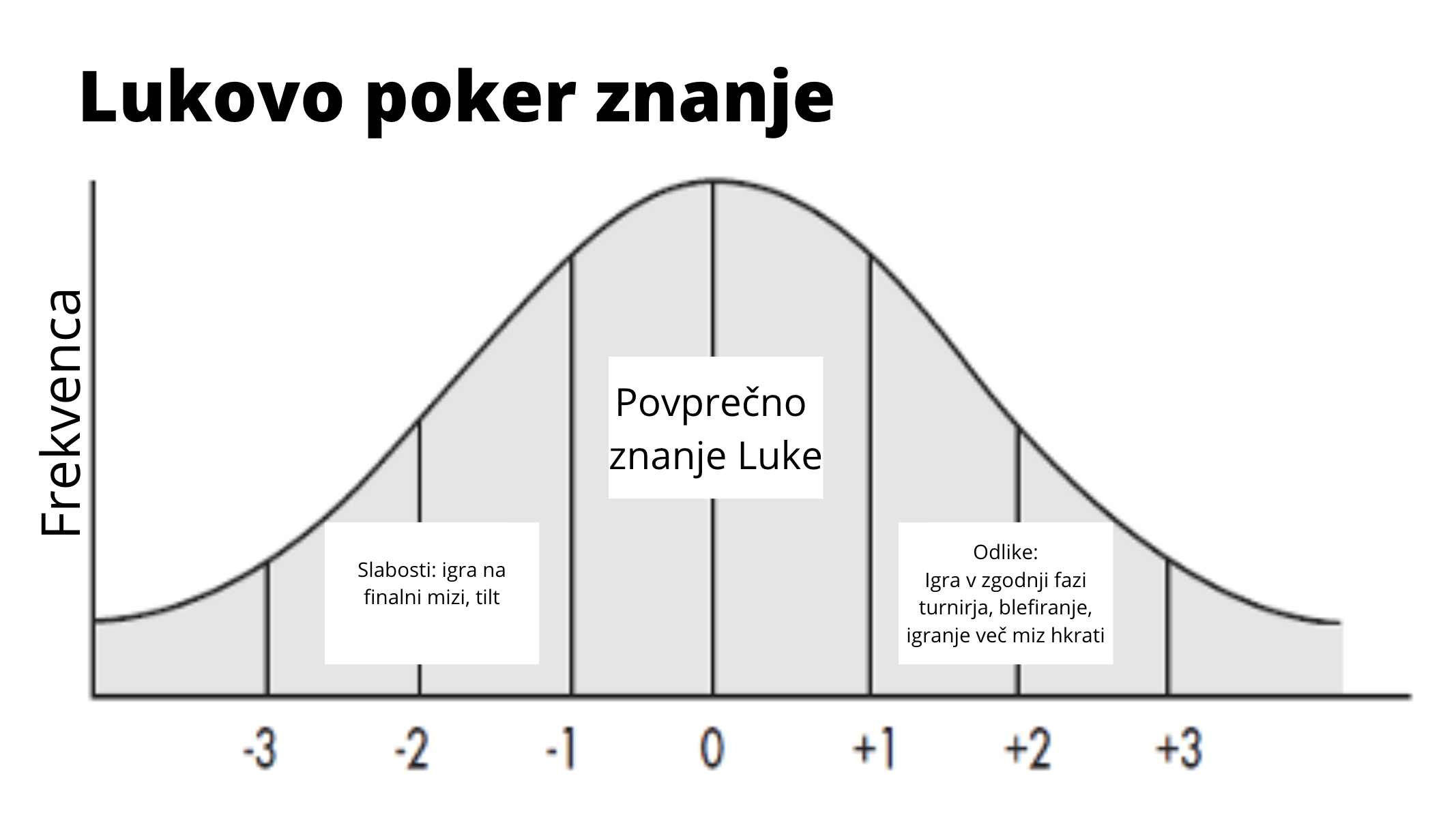 Kot lahko razberemo iz grafa, je v sredini povprečna vrednost Lukovega poker znanja. Na desni strani imamo njegove odlike, na levi pa njegove slabosti. Frekvenca nam preprosto pove, koliko časa je Luka sposoben igrati na določenem nivoju; večino časa Luka preigra povprečno glede na svoje znanje. Ker dela veliko na igri v zgodnji fazi turnirjev, na blefiranju in igranju več miz hkrati se z določeno frekvenco odražajo tudi te njegove odlike. Kot vidimo na levi strani, pa se v njegovo igro prikradejo tudi slabosti; predvsem ko Luki uspe priti na finalno mizo turnirja, njegovo pomanjkanje izkušenj omejuje njegove rezultate. Poleg tega se Luka tudi hitro razjezi, ko ima nasprotnik srečo in ga premaga v handu. Takrat Lukova koncentracija pade in celotna igra začne šepati.