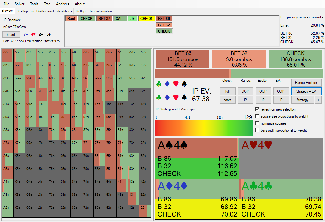 Kot vidimo ima Solver precej rajši c-bet v višini 67% pota. Ko je razlika tako velika, takrat predlagamo, da igralci uporabljate le en sizing, saj to precej poenostavi našo strategijo, še posebej ko je EV pri obeh višinah stav enak.