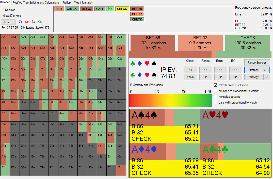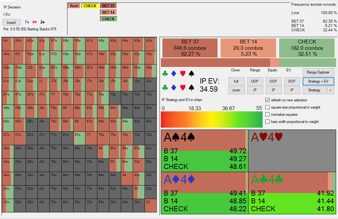 Kot vidimo ima Solver precej rajši c-bet v višini 67% pota. Ko je razlika tako velika, takrat predlagamo, da igralci uporabljate le en sizing, saj to precej poenostavi našo strategijo, še posebej ko je EV pri obeh višinah stav enak.