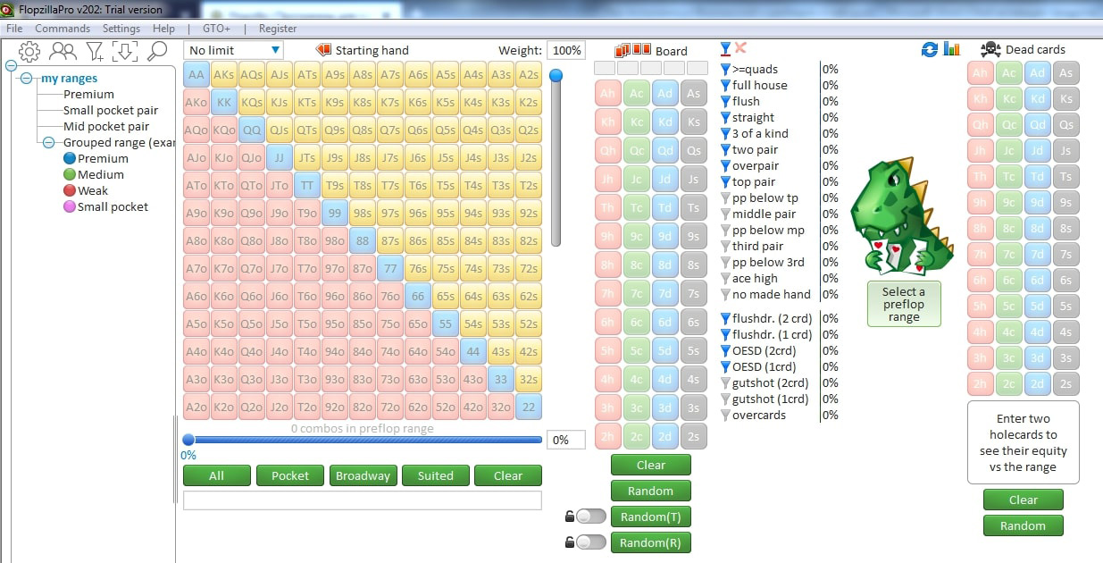Preizkusna različica FlopZilla vam daje 7 dni brezplačne uporabe. Je uporabno orodje za globljo analizo rangeov, zelo dobro razbira različne boarde ter vam lahko pomaga razumeti vašo igro po flopu. Orodje je precej preprosto za uporabo in v 7 dneh lahko iz njega izvlečete veliko uporabnih informacij, tudi brezplačno.