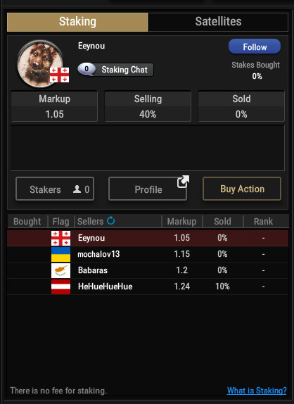 Na primer, če se registrirate na turnir v vrednosti 10 $ in prodate 50% svoje akcije z “markupom” 1,25 (marža, pribitek), kupec plača 6,25 $, da dobi 50% vaših potencialnih dobitkov, torej plačate 3,75 $ za igranje turnirja 10 $ turnirja in imate 50% svojega dobička. To je ena izmed najboljših možnosti za začetnike in naprednejše igralce, ki želijo zmanjšati tveganje ali nimajo sredstev za igranje določenih turnirjev.