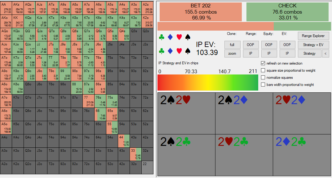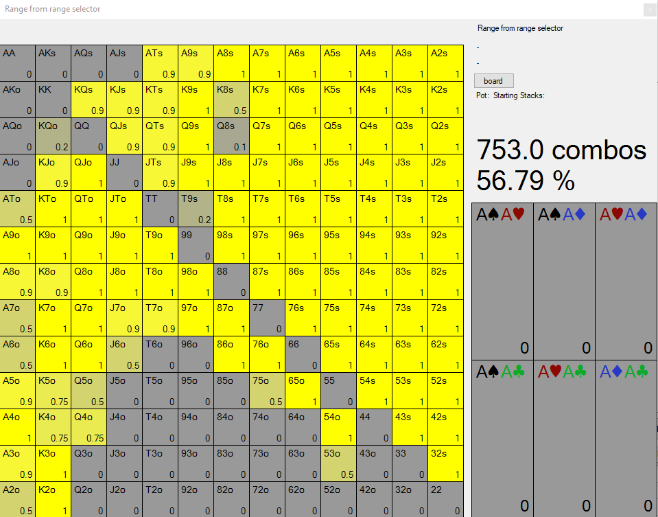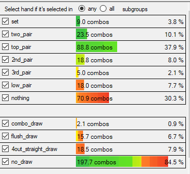 PIO Solver tukaj viša 59 kombinacij, od tega standardna dva para (ki ju vedno!!! viša – toliko o balansiranju najboljših handov). Viša še 16 kombinacij top parov, skoraj vedno ATo in v 80% primerih A9o. Vedno viša z AX (nuts backdoor flush draw), z 9